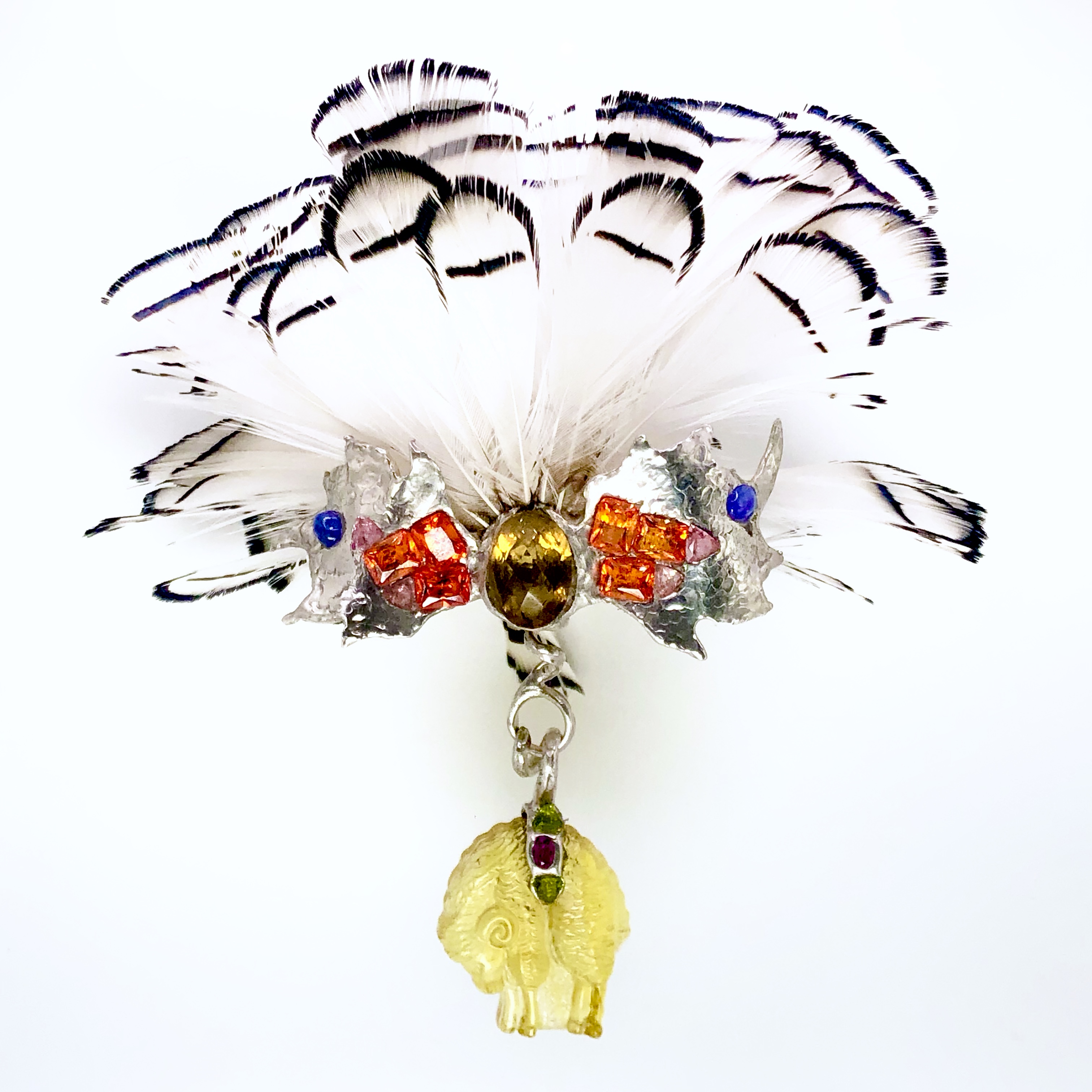 Amber, silver, smoked quartz, garnets, peridots, rubi, tourmalines, tanzanites and feathers 16 x 16 x 10 cm. 2024