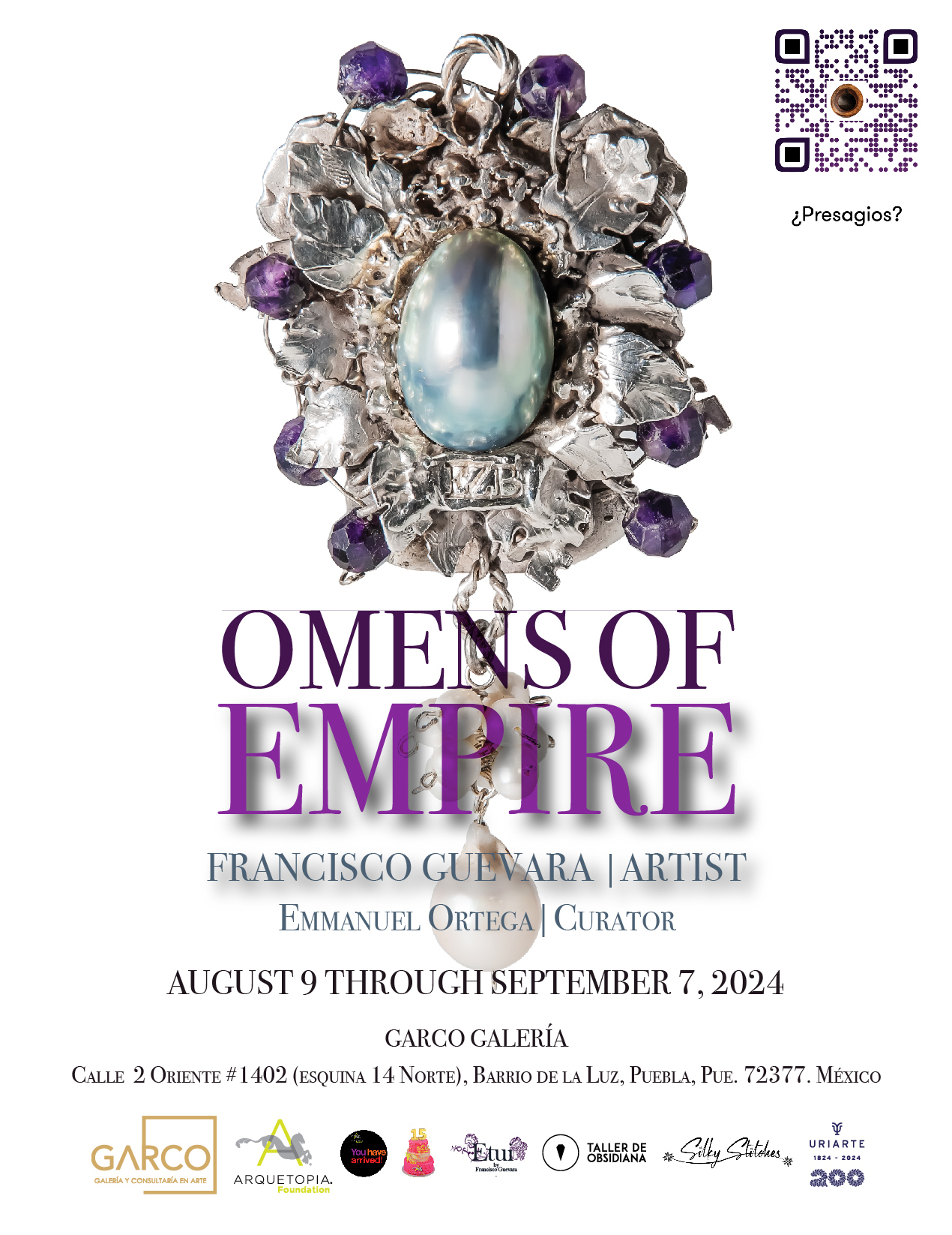 The materiality of Empire is intrinsically linked to the violence that engendered it. In Omens of Empire, Francisco Guevara explores the visual, material, and historical intersections that shape imperial narratives, presenting them in three chapters: Origin, Omens, and Violence. In this exhibition, Guevara questions the idea of personal aesthetics through selected materials, such as indigo, cochineal, and silver, revealing them as historical goods and their potential for accumulating wealth extracted from the American continent through violence and colonial labor. The origin of Empire is unveiled in the omens and materializes in the violence that becomes normalized in daily life through visual culture. Guevara approaches the notion of art from its chemical composition, materiality, and artistic perspective to make evident the structure that upholds Empire. From the capital letters of the word E.M.P.I.R.E., inspired by the choir books of the Puebla Cathedral, and referencing the seemingly syncretic mural painting in the Casa del Dean, to the gems and precious stones that reflect not only the accumulated wealth of religious orders in Mexico but the medieval superstition inherited from Europe, to the portrait painting of mythical figures that continues to glorify dreams of violence, subjugation, and exploitation of life transformed into landscape. Guevara offers us a space where the silences of history are transmuted into brilliant, complex, and deceptive apparitions.