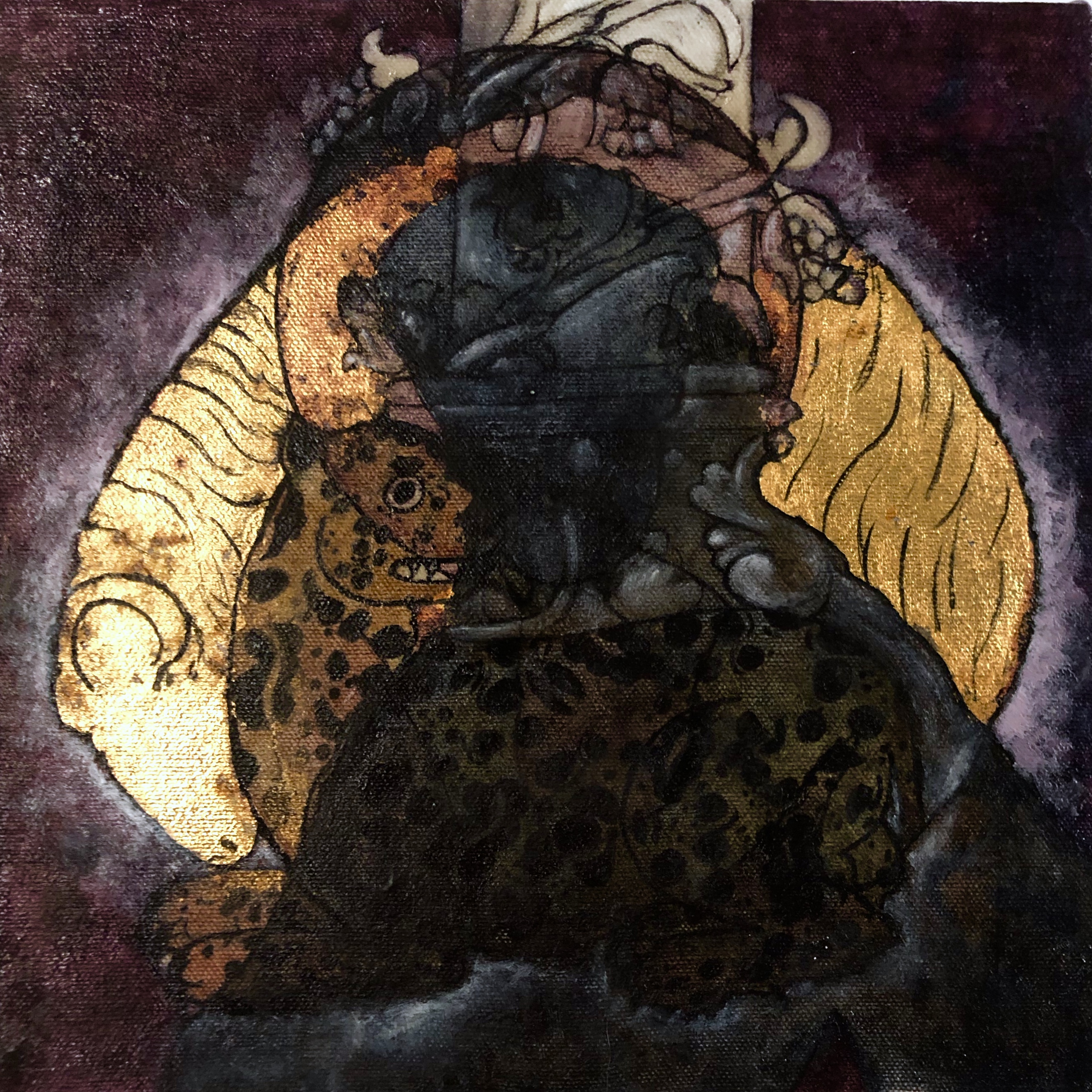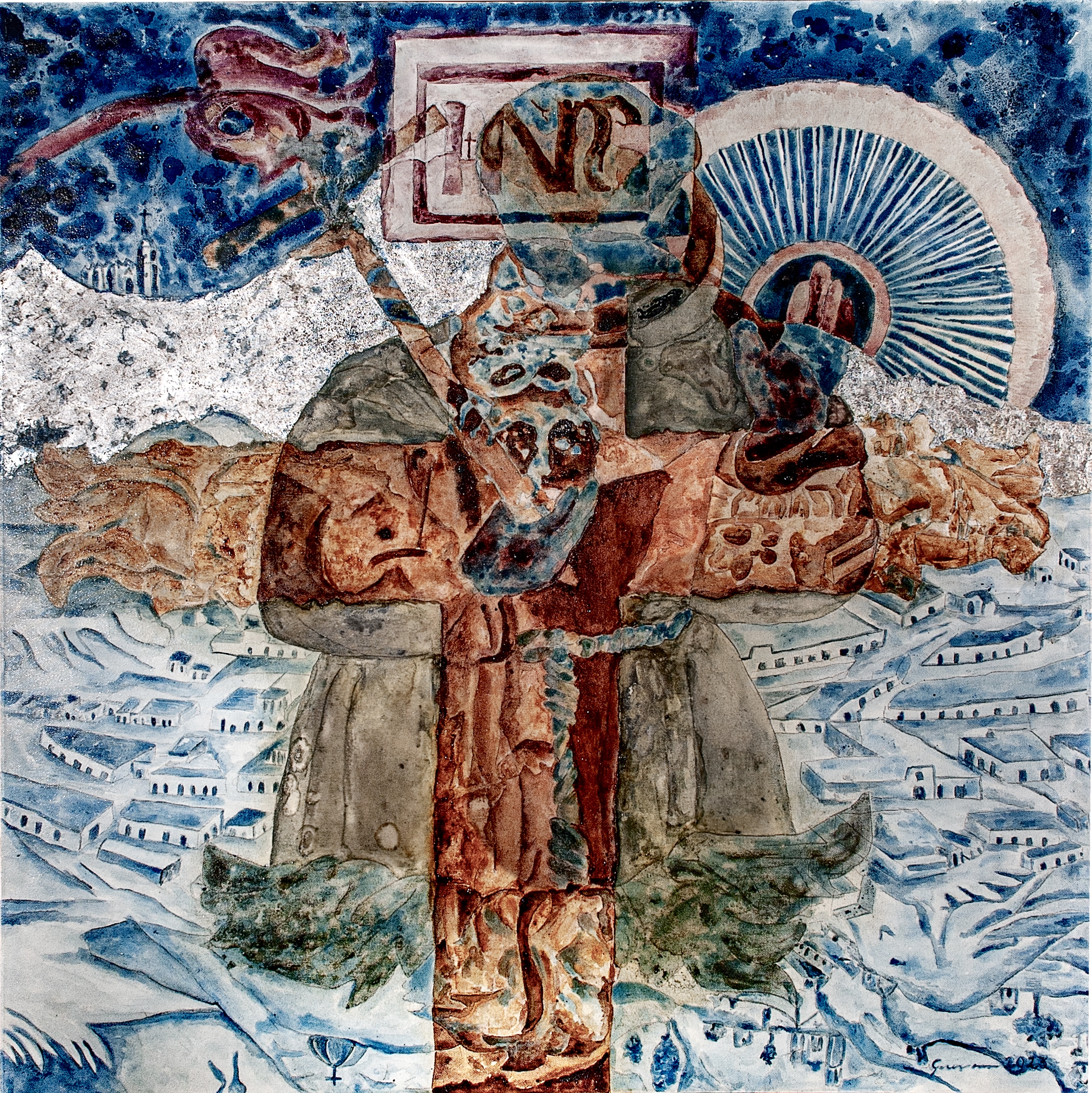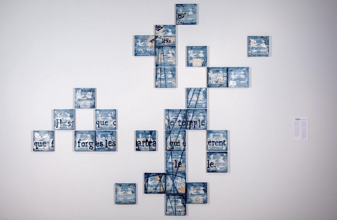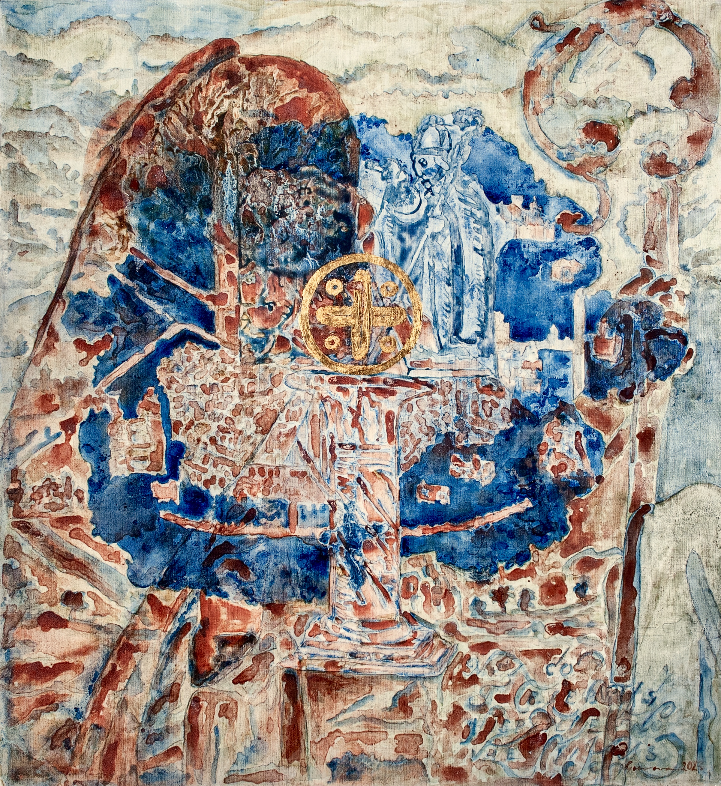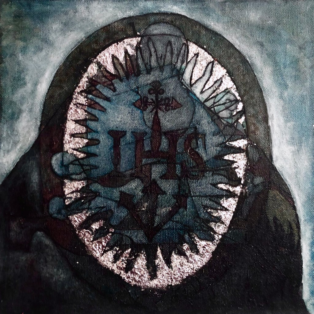“Between the Devil and the Jesuit” Indigo silkscreen, indigo ink and silver leaf on canvas. 28 x 28 cm. 2022