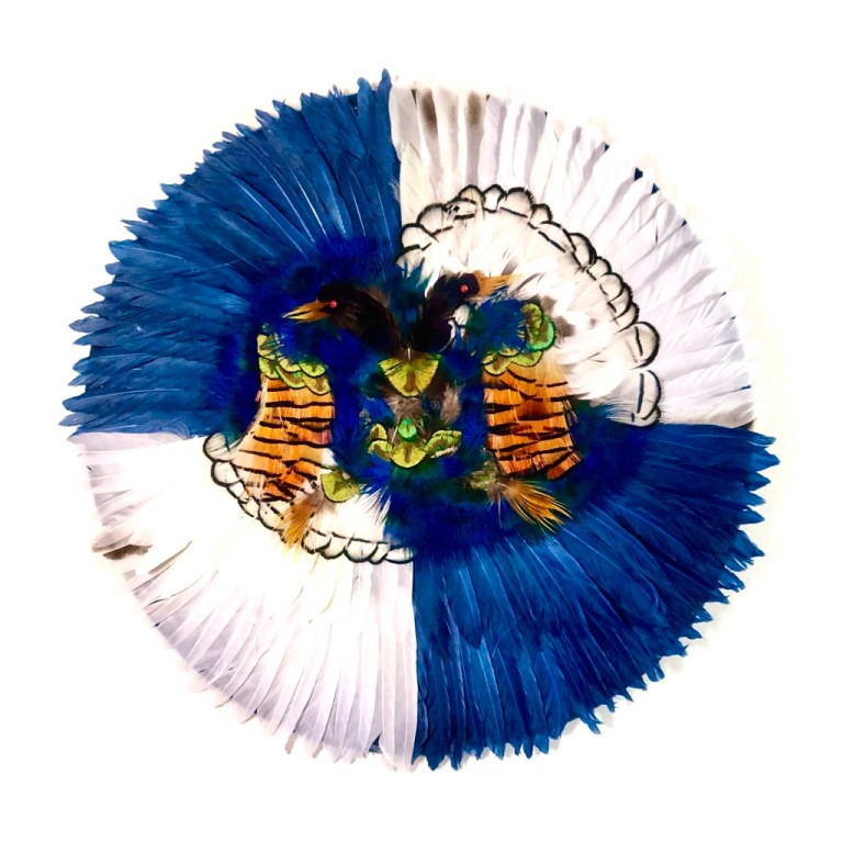 For Guevara, to see—much like in the ancient world of Mesoamerica, where nothing was revealed through the simple act of looking—is to engage in a task that conceals a complex process, one that unveils the true and complicated nature of history. His wide array of materials and mediums were carefully selected to illuminate the early processes of colonization and the shifts in perception before and after the arrival of the Spanish. Feathers, for instance, refract the light of the sun and the power of tonalli, a Nahuatl concept signifying force or energy. With the Spanish, the tonalli of feathers was transformed into lux mundi, a manifestation of Christ’s power.